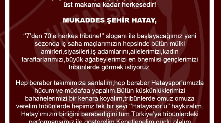 “Bu çağrımız kimliğinde Hatay ibaresi bulunan her Hataylıya özeldir. Bu çağrımız Hatay’da yaşayan en alt kademeden en üst makama kadar herkesedir! Mukaddes şehir Hatay, ‘7’den 70’e herkes tribüne’’ sloganı ile başlayacağımız yeni sezonda iç saha maçlarımızın hepsinde bütün mülki amirleri, siyasileri, iş adamlarını, ailelerimizi, kadın taraftarlarımızı, büyük ağabeylerimizi, en önemlisi gençlerimizi tribünlerde görmek istiyoruz.