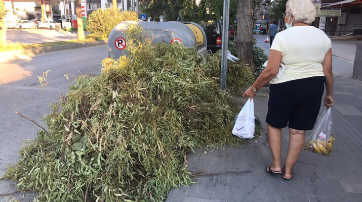 Hatay’ın Defne ilçesinde çöp konteynırının çevresine atılan ağaç dalları görüntü kirliliğine neden oldu.
