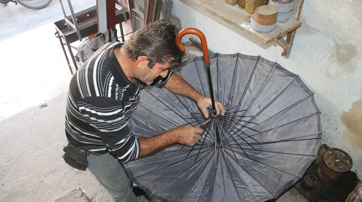 Antakya’nın tek şemsiye tamircisi Ali Devecioğlu kış mesaisine başladı.