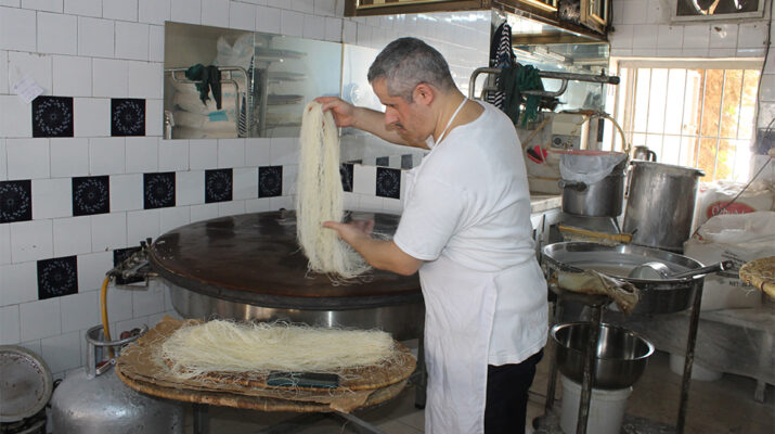 Hatay’ın meşhur lezzetlerinden biri olan künefenin ham maddesi olan tel kadayıf 24 yıldır usta eller Mursel Ceylan tarafından hazırlanıyor.