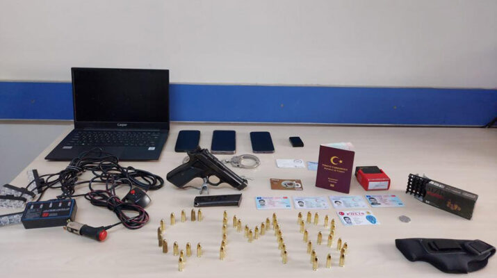 Araçta yapılan aramada, sahte polis kimliği, kelepçe, çakar lamba ve sahte nüfus cüzdanları ele geçirildi.