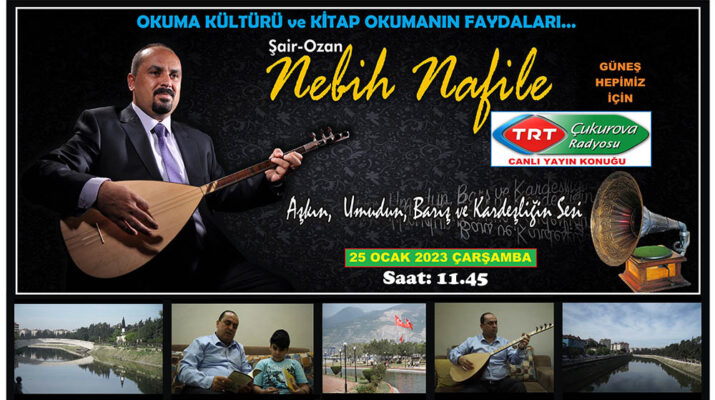 Şair-ozan Nebih Nafile, 25 Ocak 2023 Çarşamba günü (Bugün) Çukurova Radyosu ve Doğuş TV’nin canlı yayın konuğu olacak. Saat 11.45’te Çukurova Radyosu telefon bağlantısıyla gerçekleşecek olan programda, Kültür Kentleri Birliği Hatay İl Temsilcisi Nebih Nafile; 3 Şubat 2023’te açılışı olacak olan Defne Kitap Fuarı hakkında bilgi vererek, öğrencilerin de yarıyıl tatilinde olmasından dolayı bir eğitimci olarak “Okuma kültürü ve okumanın faydaları” hakkında bildiklerini paylaşacak.