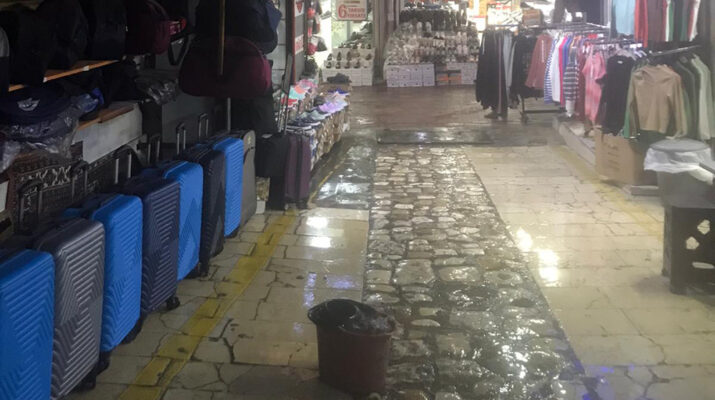 Tarihi Uzun Çarşının bazı bölgelerindeki çatıların su akıtması esnafın ürünlerine zarar verdi. Çarşı esnafı, farklı noktalara plastik kovalar koyarak önlem almak zorunda kaldı.