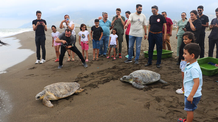 Hatay’da arka yüzgeçlerinden yaralanan yeÅŸil deniz kaplumbaÄŸası “Mavi” ile hasta ve bitkin bulunan caretta caretta “Deniz”, Hatay Mustafa Kemal Üniversitesi (HMKÜ) Deniz KaplumbaÄŸaları İlk Yardım ve Tedavi Merkezi’ndeki (DEKİYM) tedavilerinin ardından maviliklere uÄŸurlandı.