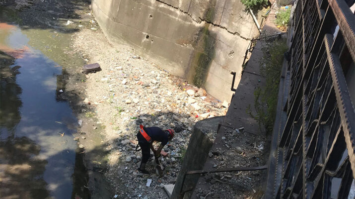Çevredekilerin ihbarı üzerine bölgeye gelen Hatay Büyükşehir Belediyesi itfaiye ekipleri, derede sıkışan kediyi çıkarmak için çalışmalara başladı.