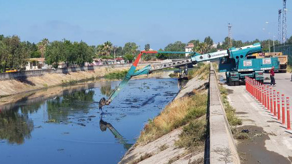 Hatay’ın İskenderun ilçesinde kenti sel sularından korumak üzere yapılan Feyezan Kanalında DSİ Devlet Su İşleri ile Belediye ekiplerinin ortaklaşa yürüttüğü temizlik çalışmaları sürdürüyor.