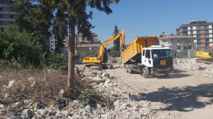 Fotoğrafta Antakya’da Enkaz kaldırma çalışmalarında bulunan iş araçları görülüyor.