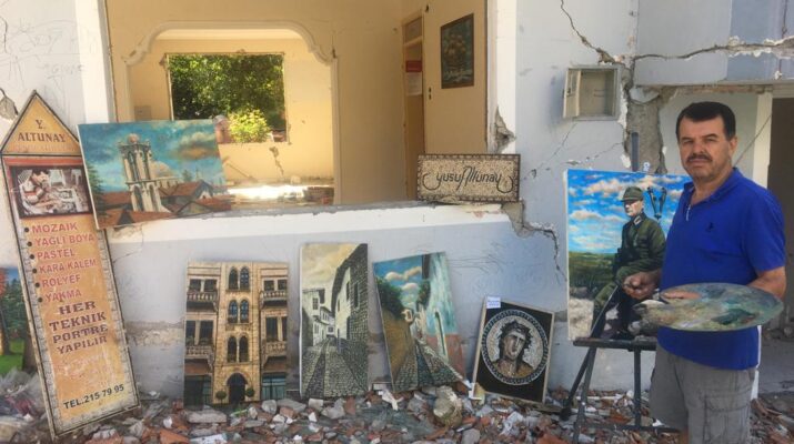 Hatay’ın tanınan ressam ve mozaik sanatçısı Yusuf Altunay, enkazların arasında sanatını icra etmeye devam ediyor.