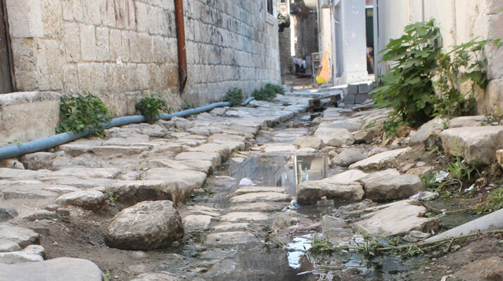 Antakya’nın tarihi sokaklarının taşları arasından sızan kirli su etrafa kötü koku yaydığı gibi yosunlu görüntüsü ile de çevre kirliliğine neden oluyor.