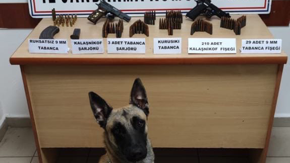 Rodi isimli özel eğitimli köpekle şüphelinin evinde arama yapan ekipler, otomatik silaha ait şarjör, 210 fişek, ruhsatsız tabanca, tabancaya ait 2 şarjör, 29 tabanca fişeği, faturasız kuru sıkı tabanca ve ona ait şarjör ele geçirildi.