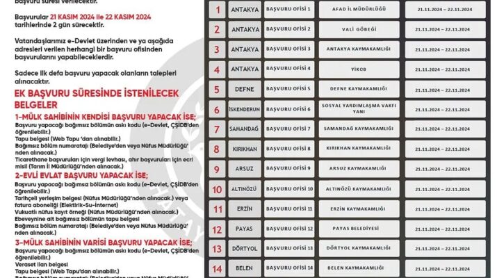 AFAD, afetzedelerin hak kaybına uğramamaları için başvuru sürecini hatırlatarak başvuruların belirtilen tarihlerde yapılması gerektiğini belirtti. Başvuru ofislerini de açıklayan valilik E-Devlet üzerinden de başvurulabildiğini hatırlattı.