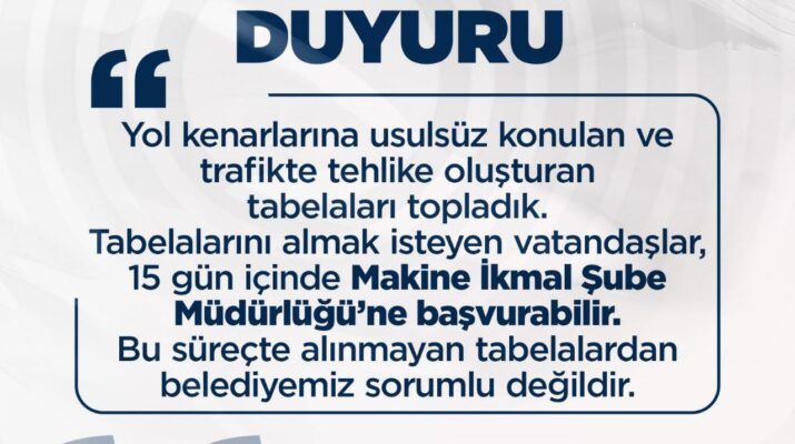 Açıklamada, tabelalarını geri almak isteyen vatandaşların, Antakya ilçesi Aksaray Mahallesi Şükrü Balcı Caddesi’nde bulunan İtfaiye Daire Başkanlığı İstasyonu’nda hizmet veren Makine İkmal Şube Müdürlüğüne başvurabilecekleri ifade edildi.