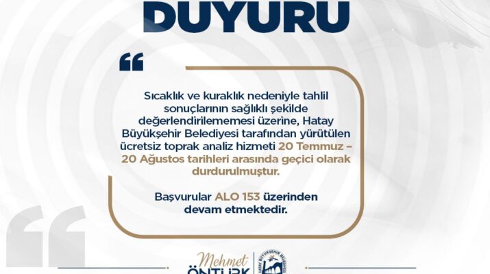 Hatay Büyükşehir Belediyesi (HBB), çiftçilere yönelik vermiş olduğu ücretsiz toprak analizi hizmetini ertelediğini duyurdu.