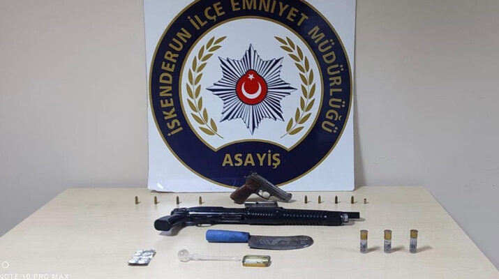 Adreslerde ruhsatsız tabanca ve buna ait mermi, satır ile bir miktar uyuşturucu ele geçirildi.