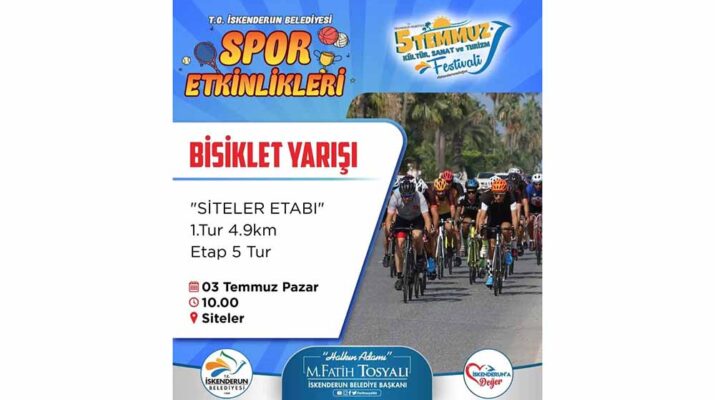 Başkan Tosyalı Yarışma ile ilgili şunları kaydetti: “5 Temmuz Kültür, Sanat ve Turizm Festivali etkinlikleri kapsamında bir takım sportif etkinlikler düzenliyoruz. Gençlik ve Spor Müdürlüğümüzün koordinesinde düzenlenecek yarışma için son başvuru tarihi 30 Haziran 2022. Başvuru Merkezi Sahil Spor Kompleksi. Bisiklet yarışı 1.tur 4,9 km olacak. 5 Etap (tur) şeklinde gerçekleştirilecek olan yarışma saat 10.00’da İDÇ Sitesi içerisinde gerçekleştirilecektir.