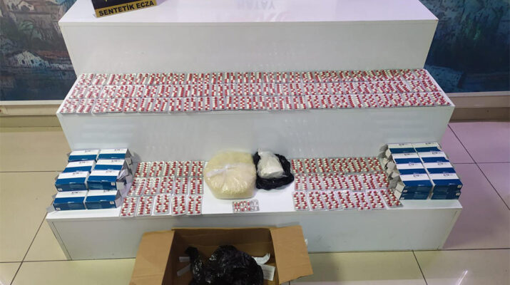 Hatay’da otobüs terminalinde künefe yapım malzemelerinin bulunduÄŸu koliye gizlenmiÅŸ 1648 sentetik ecza ele geçirildi.