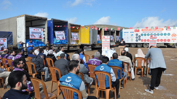 Uluslararası Al Rahma DerneÄŸi, Ataa İnsani YardımlaÅŸma DerneÄŸi ile Åžam Hayır ve YardımlaÅŸma DerneÄŸinin organizesinde temin edilen yardımlar için Hatay’ın Reyhanlı ilçesindeki Cilvegözü Sınır Kapısı yakınlarında bulunan tır garajında uÄŸurlama töreni