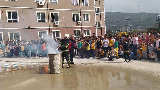 Okul bahçesinde itfaiye ekipleri tarafından öğrencilere yangına müdahale ve yangın söndürme cihazları hakkında bilgiler verildi. Tatbikat, öğrenciler arasında büyük heyecan yarattı.