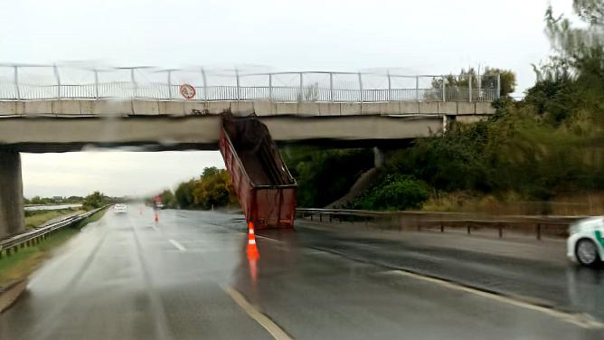 Otobanda TIR’ın kasası köprüye takılı kaldı!