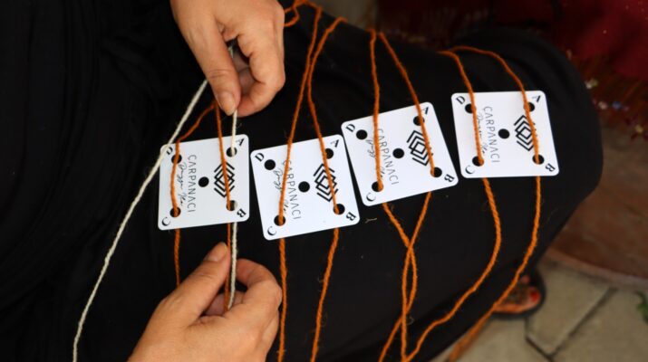 Dalioğlu, bu tekniğin inceliklerini şöyle anlatıyor: “Gördüğünüz gibi her kartta 4 delik bulunur. Bu deliklerden geçirilen iplikler, kartların döndürülmesiyle hareket eder. Kartların yönüne ve sırasına göre desen oluşur. Tamamen el ile yapılan, dikkat ve sabır isteyen bir tekniktir”