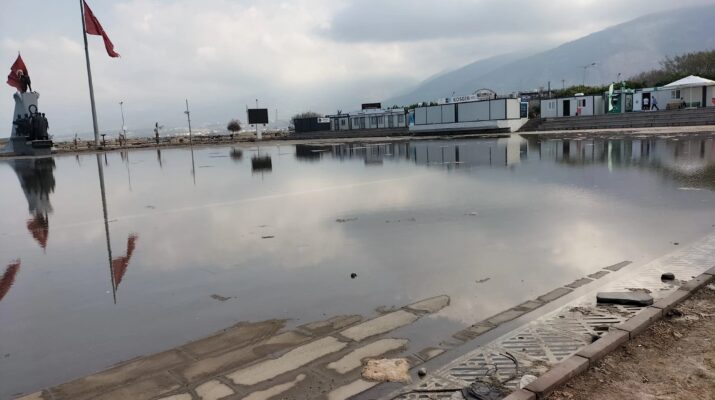 Depremin vurduğu Hatay’ın İskenderun ilçesi sahili meydana gelen zemin ve altyapı çökmesi, denizin yükselmesiyle Atatürk bulvarı ile Anıt alanı sular altında kalmaktan kurtulamadı.
