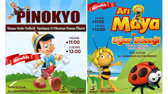 Tiyatro gösterileri ikişer seanslar halinde oynanacak olup, 22 Ocak 2022 Cumartesi günü saat 11.00 ve 13.00’da“Pinokyo”, 23 Ocak 2022 Pazar günü saat 11.00 ve 13.00’da “Arı Maya ile Uğur Böceği”    tiyatro oyunları Samandağ Kültür Merkezi’nde çocuklar için ücretsiz sahnelenecek.