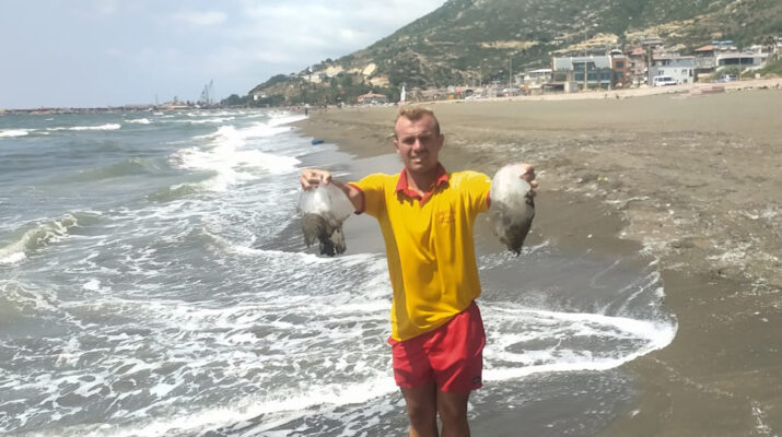 Hatay Büyükşehir Belediyesi Cankurtaran timleri, Çevlik Sahili kıyısında deniz anası ve balon balıkları olduğu ihbarı aldı.