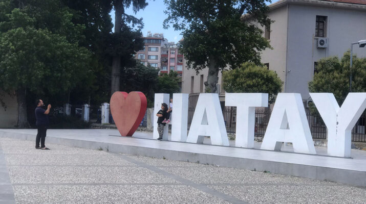 Antakya Atatürk Parkı girişine monte edilen ışıklı ‘HATAY’ tabelası en çok çocukların dikkatini çekiyor.