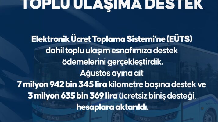 HBB, 7 milyon 942 bin 345 liralık ağustos ayı kilometre başına destekleme ödemesi ile ağustos ayı ücretsiz biniş desteği ödemesi olan 3 milyon 635 bin 369 liranın EÜTS’ye dahil olan toplu ulaşım esnafının hesaplarına aktardı.