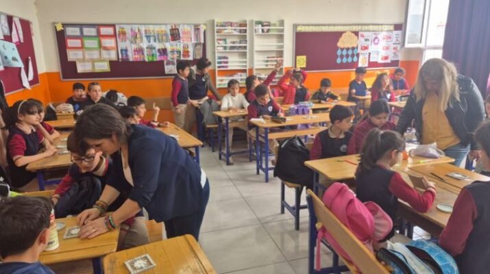 Bu kapsamda, Şehit İlker Uylaş İlkokulu’nda gerçekleştirilen etkinlikte Mansuroğlu ve Zateri, öğrencilere mozaik sanatının inceliklerini anlattı.