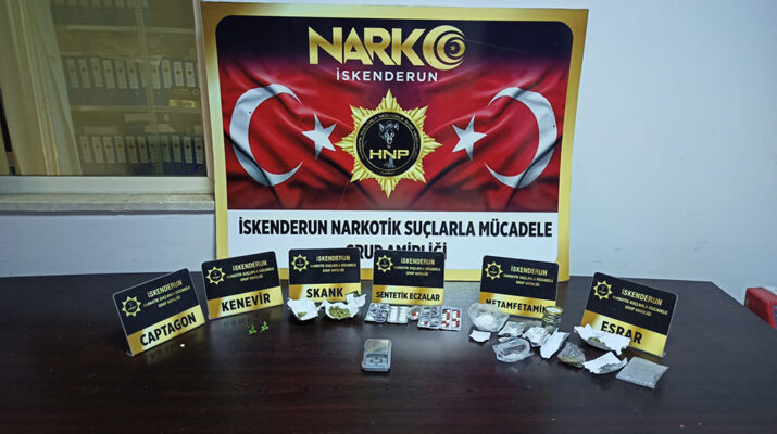 Hatay Emniyet Müdürlüğü görevlilerince uyuÅŸturucu ve uyarıcı madde imal ve ticaretine yönelik İskenderun’da yapılan çalışmalar kapsamında; M.Ö.’nün Buluttepe Mahallesi’nde bulunan ikametinde yapılan aramada; 6 gram skunk, 2 kök hint keneviri, 24 adet sentetik ecza, H.Y.’nin Piri Reis Mahallesi’nde bulunan ikametinde yapılan aramada; 5 gram esrar, 22 gram metamfetamin, 1 adet captagon, 3 adet sentetik ecza, 1 adet hassas terazi ele geçirildi.