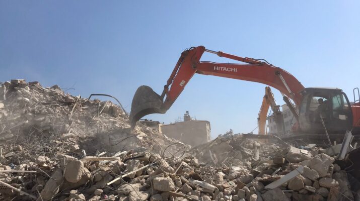 Fotoğraflarda yıkımın çok miktarda yaşandığı Defne ilçesi ve Defne ilçesinde yıkım firmalarına ait kepçeler yıkım ve enkaz kaldırma çalışmalarında bulunurken görülüyor.